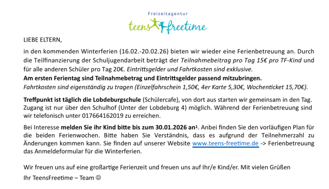 Winterferien ab sofort buchbar. Anmeldeschluss 31.01.2026